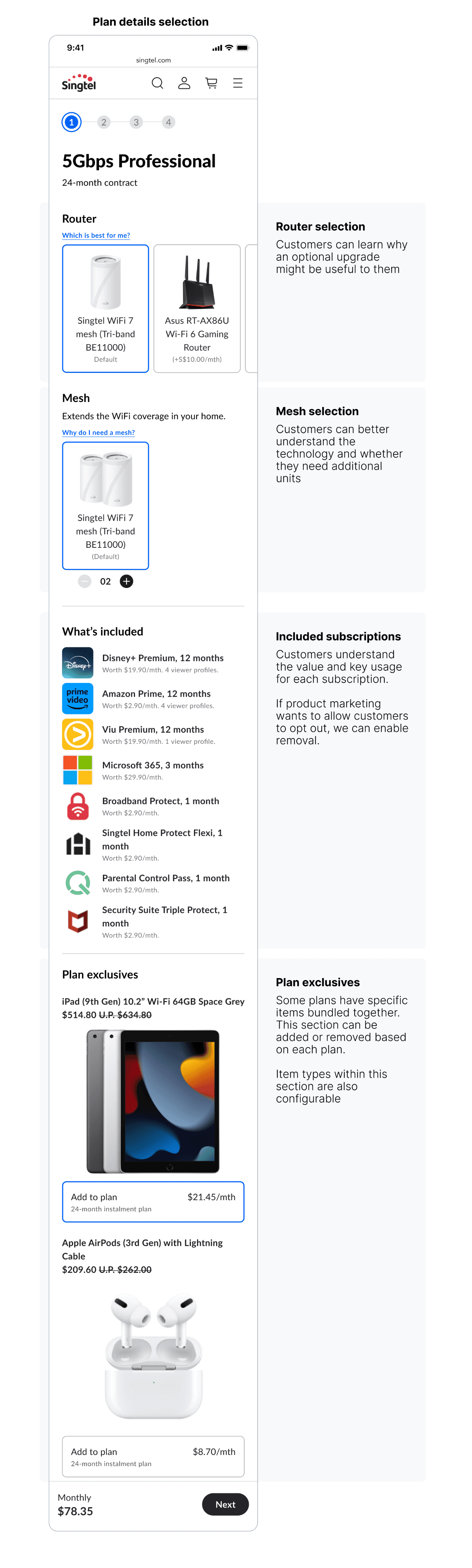With plans ranging from basic broadband to bundles with entertainment subscriptions and lifestyle devices, we needed a system that could adapt without rebuilding the entire flow each time.