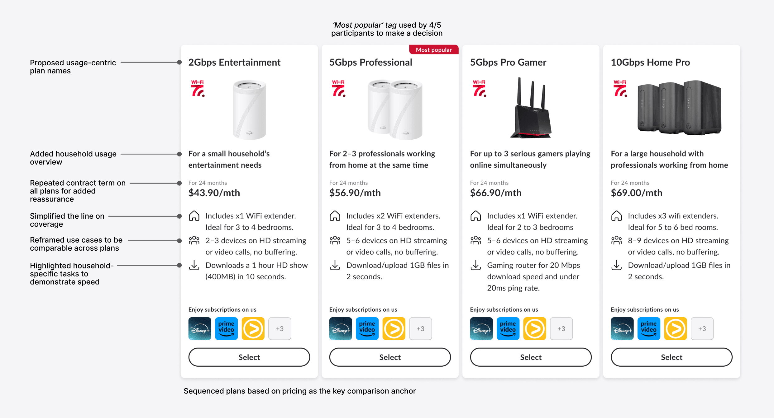 One key finding was around how broadband plans were described. Traditionally, plans focused on what they included, but our testing showed that a different content angle resonated better with customers.